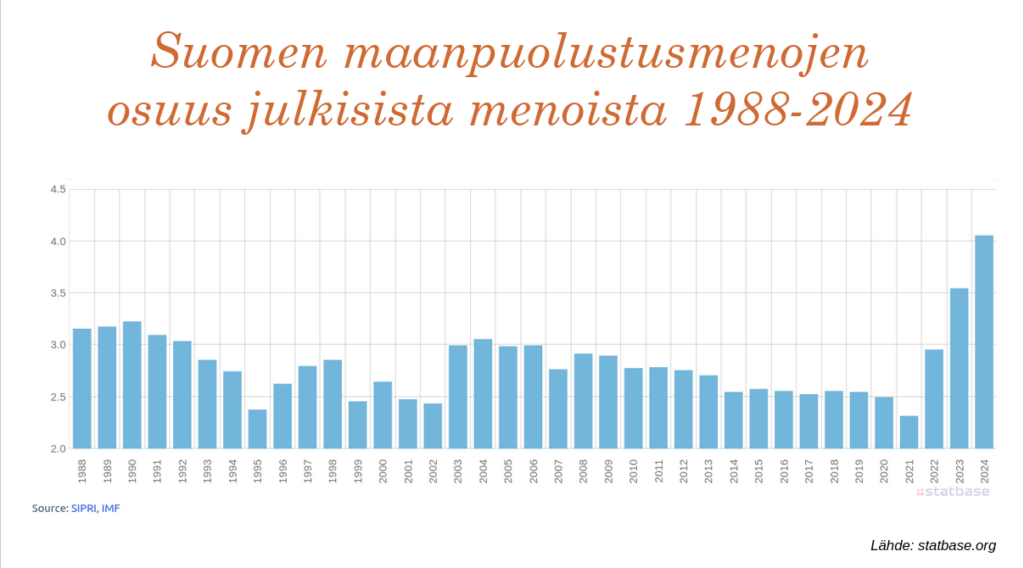 Mutta ehkä kaikkein tuhoisinta on se, että olemme Nato-sopimuksella sitoneet asevarustelumenomme kansantalouden kehitykseen. Eli asevarustelumenot nousevat tai laskevat tulevaisuudessa sen mukaan miten kansantaloutemme kehittyy. Ei siis sen mukaan miten puolustuskykymme tai Euroopan turvallisuuspoliittinen tilanne kehittyy.