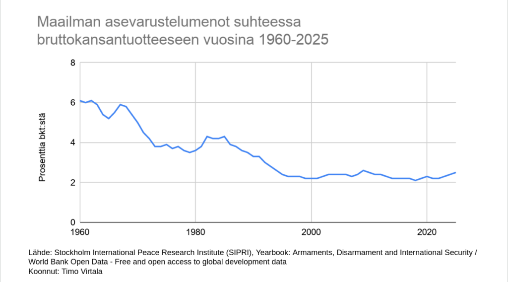 Siinä kansainväliset asevarustelumenot esitetään suhteessa maailman bruttokansantuotteeseen vuosikymmenten perspektiivillä. Siitä käy ilmi, että vaikka militarisaatio on nousussa, olemme ainakin vielä toistaiseksi kuitenkin kaukana 1960- ja 1980-lukujen militarisaation taakasta.