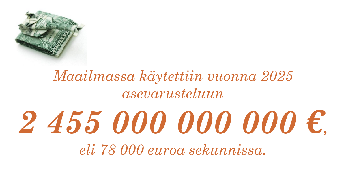 Väite 2: Viime vuonna toteutettu maailmanlaajuinen 2,5 biljoonan euron satsaus asevarusteluun oli katastrofaalinen ihmiskunnan kollektiivinen epäonnistuminen. Samaan aikaan kun 28 % maailman ihmisistä eli ruokaturvalttomuudessa, viisi miljardia lasta kuoli aliravitsemukseen ja ilmastonmuutoksen torujunta, luontokadon pysäyttäminen, tutkimus, koulutus, tasa-arvo ja sosiaali- ja terveydenhuoltosektori kärsivät vakavista alirahoituksesta, ihmiskunta satsasi 2 455 000 000 000 €, toisin sanoen 78 000 euroa joka ikinen sekunti, aseisiin ja armeijoihin.